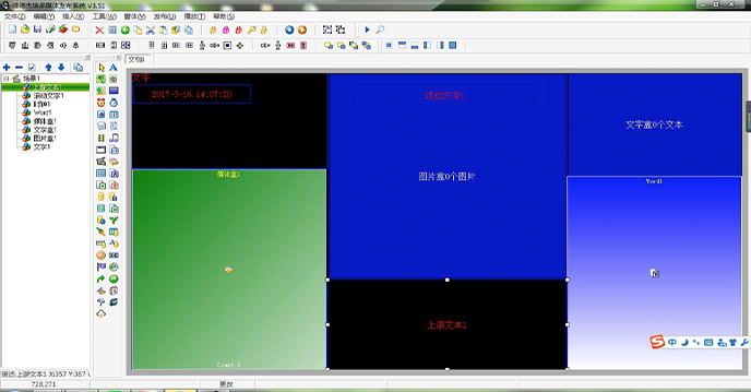 音頻播放可采用立體聲、雙道;支持MP3,AC3,PCM,WMA等格式;系統(tǒng)音頻文件播放可以隱藏任務(wù)方式編排和播放,不影響可見(jiàn)窗口的媒體播放,即可播放背景音樂(lè)。可以設(shè)置圖片、文字的透明、半透明顯示及附加窗口顯示;可設(shè)置圖片的切換效果。支持多種中文字體和字形,同時(shí)還可輸入英文、西班牙文、法文、德文、希臘文、俄文、日文等多種文字。播放文字信息時(shí)具有透明、半透明等顯示效果,且播放位置可隨意設(shè)置。每個(gè)節(jié)目都是由多種節(jié)目元素構(gòu)成,如視頻、圖像、文字等。系統(tǒng)提供了數(shù)十種節(jié)目組件,有效提高節(jié)目的設(shè)計(jì)速度和質(zhì)量。組件的使用也相當(dāng)簡(jiǎn)單,只需設(shè)置一下播放屬性即可。系統(tǒng)中的組件按功能分為以下六大類(lèi):